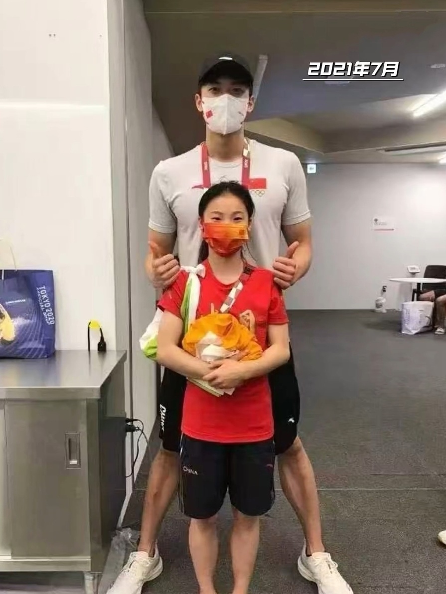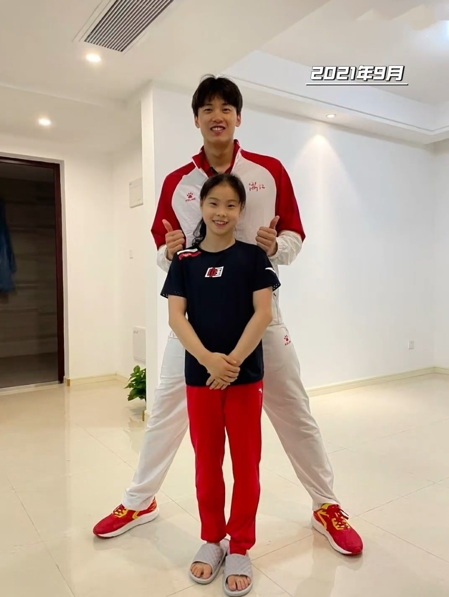第二张则是21年9月份,汪顺穿着颁奖礼服,脚穿显眼中国红运动鞋;而管晨辰还穿着拖鞋的合影。