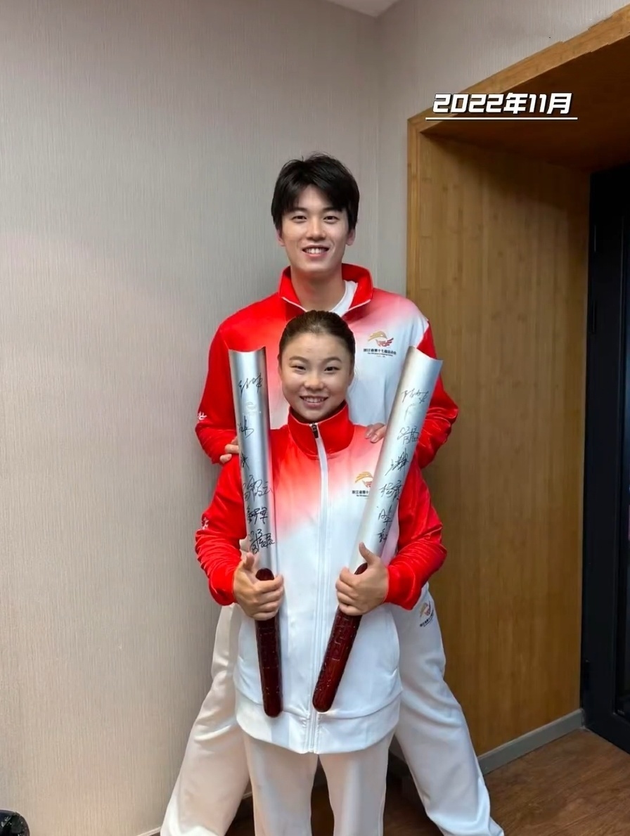 第三张则是22年11月,两人担任浙江省第十七届省运会火炬手时的合影。