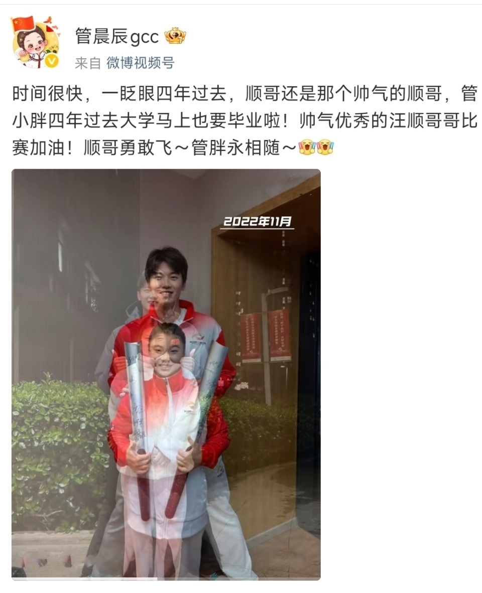 “时间很快,一眨眼四年过去,顺哥还是那个帅气的顺哥,管小胖四年过去大学马上也要毕业啦!帅气优秀的汪顺哥哥比赛加油!顺哥勇敢飞~管胖永相随~”